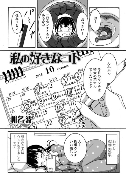 私の好きなコトは…・ウ○チをすることです♪ウ○チをするのって気持ちイイ!便意が来るとドキドキワクワクして、他のことが考えられない!我慢しているときのもどかしさもクセになる。便器に腰を下ろしてお尻の穴を開いていく瞬間が好き。最高です!学校でするウ○チは緊張感がいいんです。扉を挟んだ隣でも、清楚な子やクールな子が私と同じように、ウ○チしているのかなあって考えます。たまたま流しそこなった他の人のウ○チに…